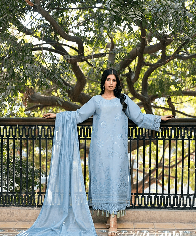 A delicate sky blue Falak featuring subtle embroidery that enhances its charm. The lightweight fabric makes it perfect for daytime wear, while the coordinating trousers and a flowing dupatta complete the ethereal look.