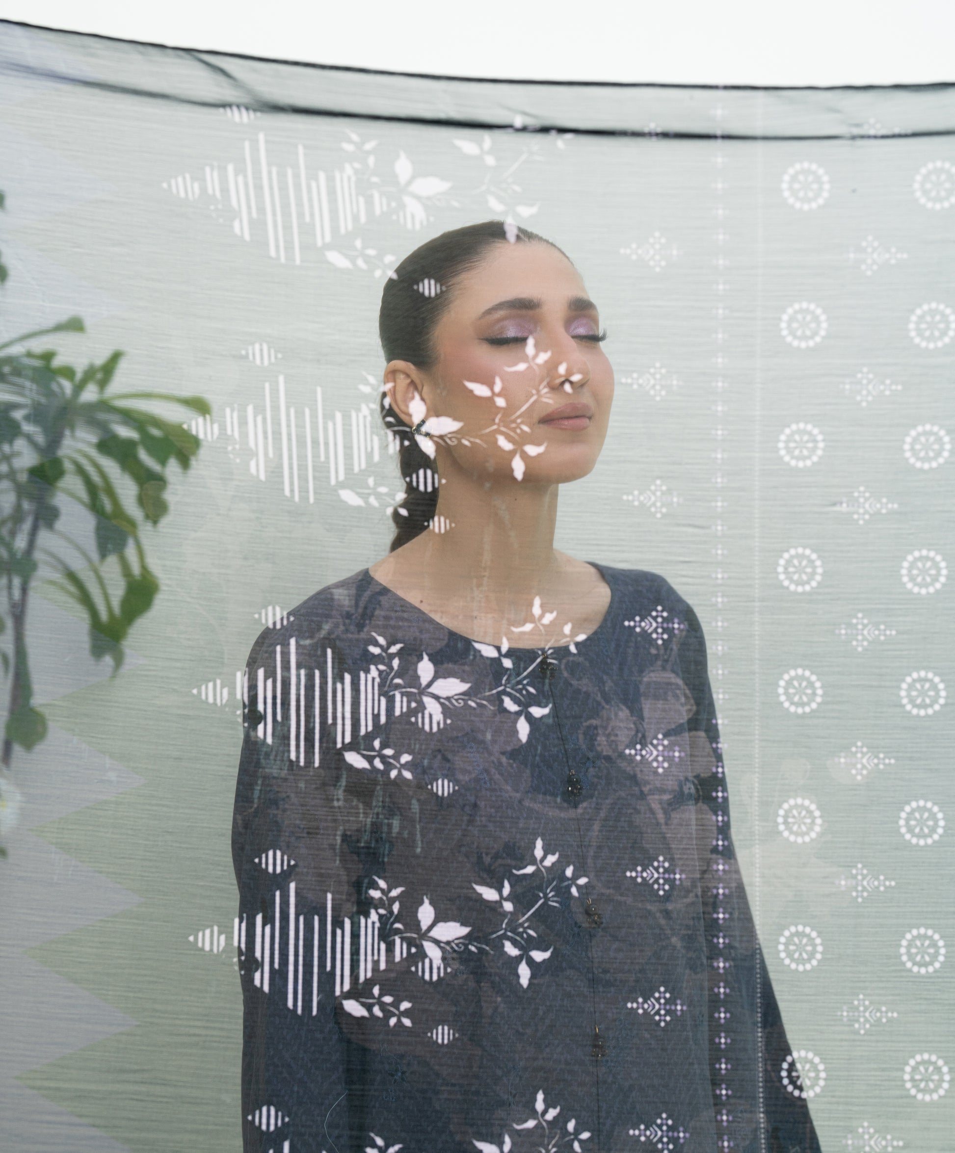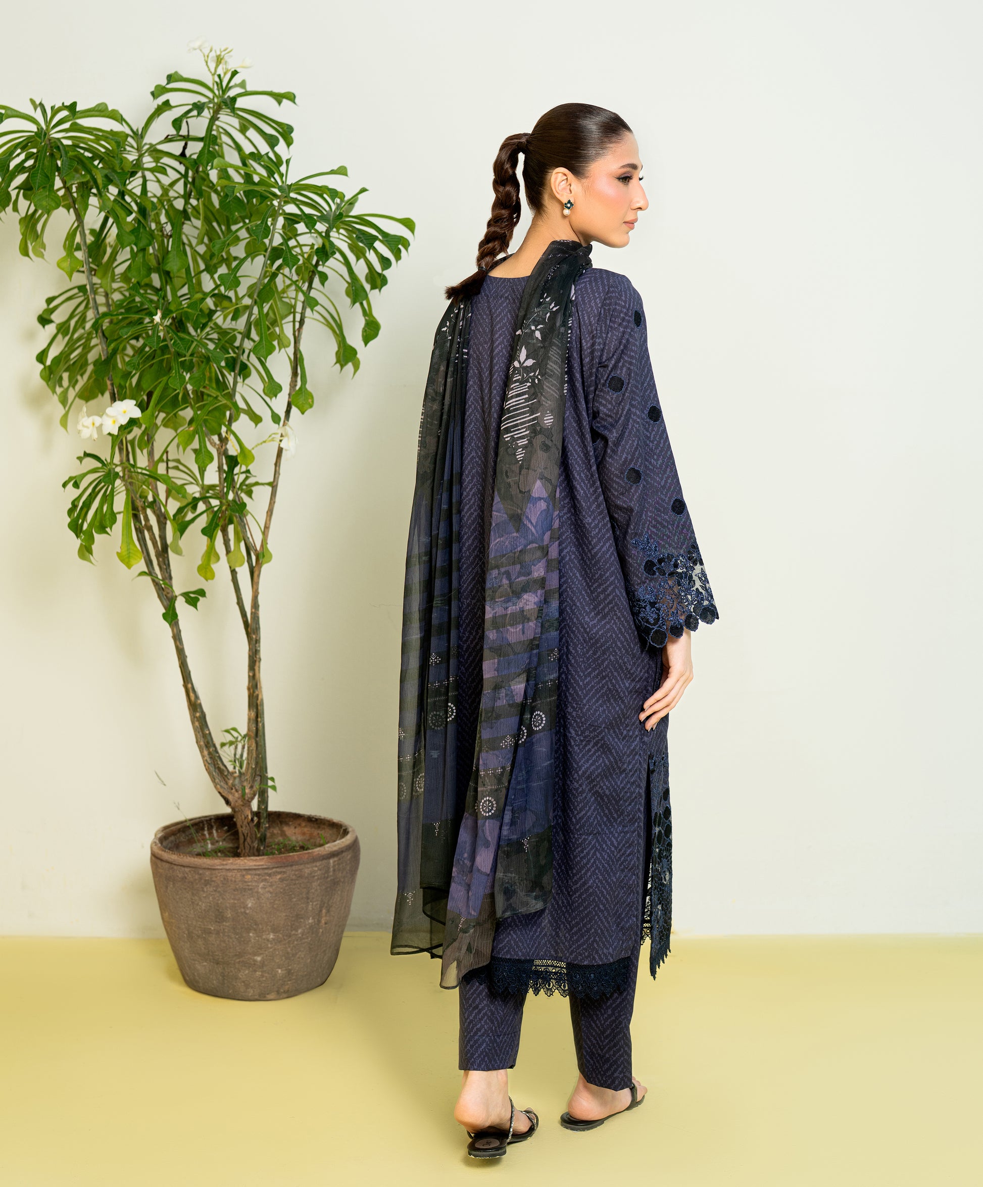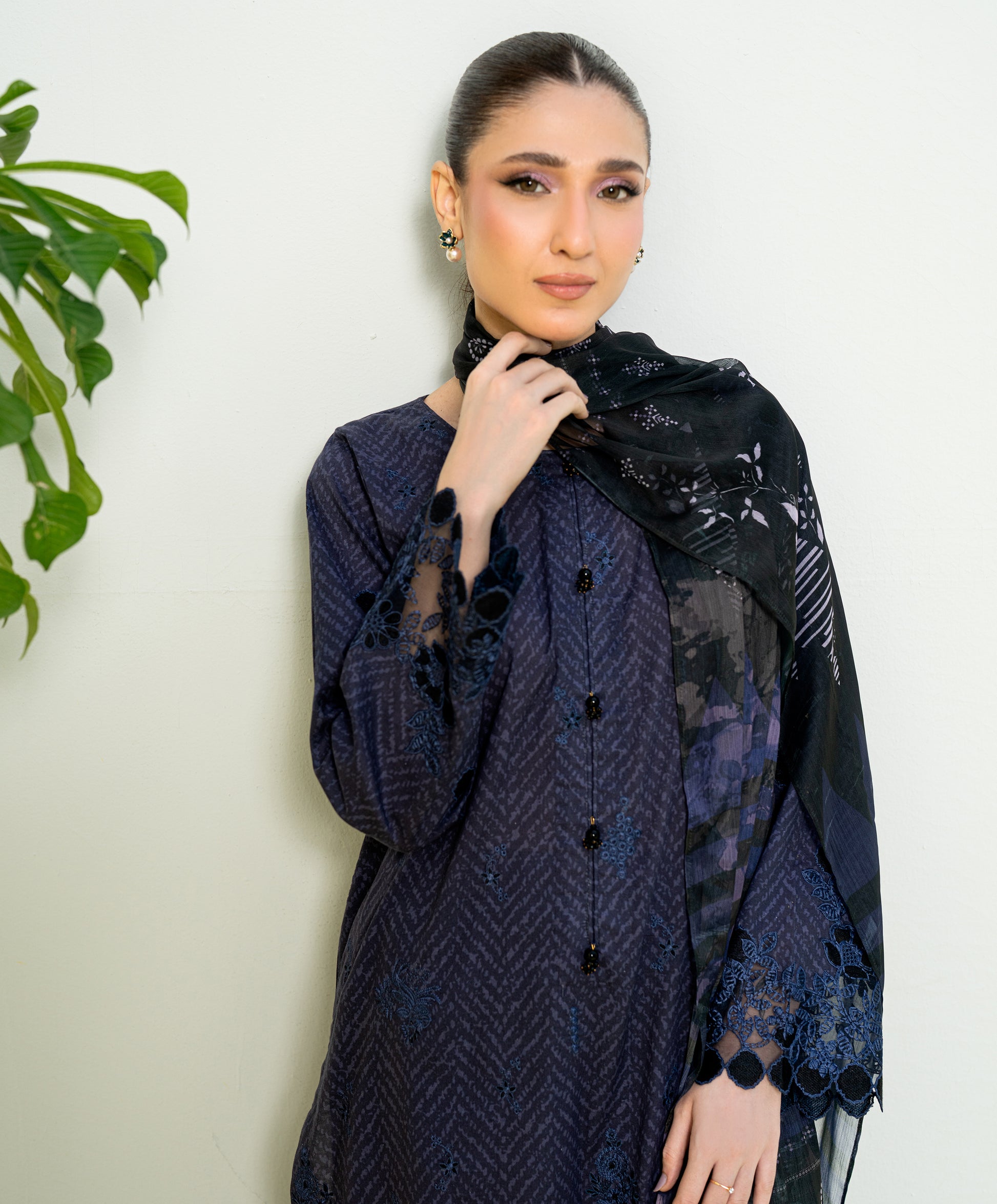 Deep navy whispers and black threads shimmer — classic, but never quiet. (embroidery on print) 3pc cambric with printed butter chiffon dupatta