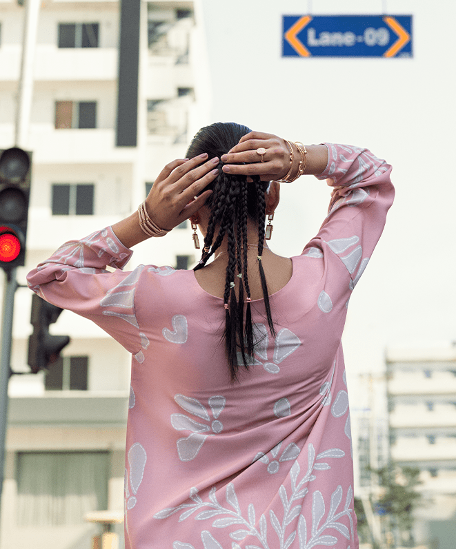 Indulge in the whimsical charm of Fairy Floss. It features a soft pastel pink outfit featuring delicate white intricate, nature-inspired pattern. The subtle contrast between the pink fabric and the white details adds to its airy, feminine appeal.