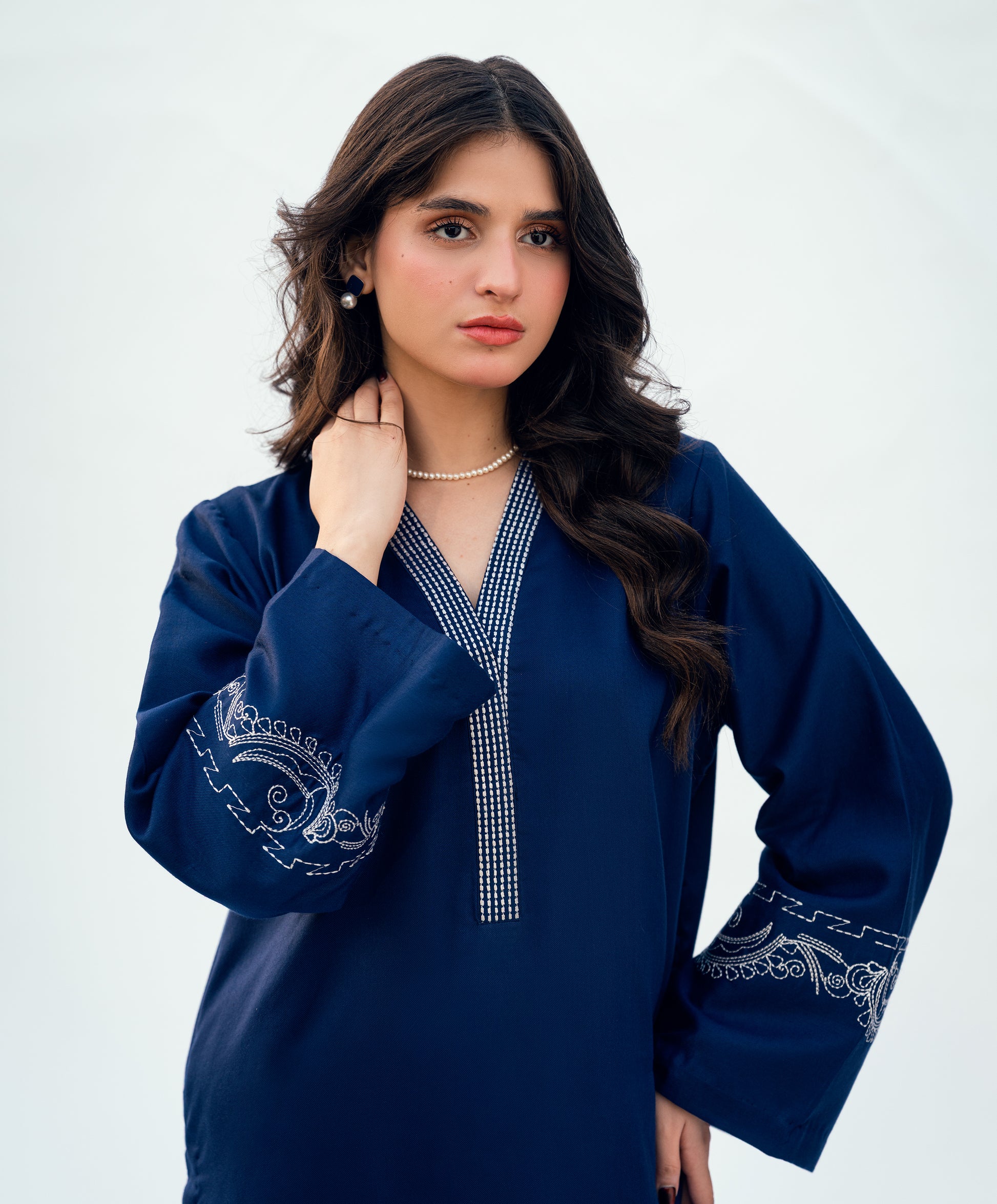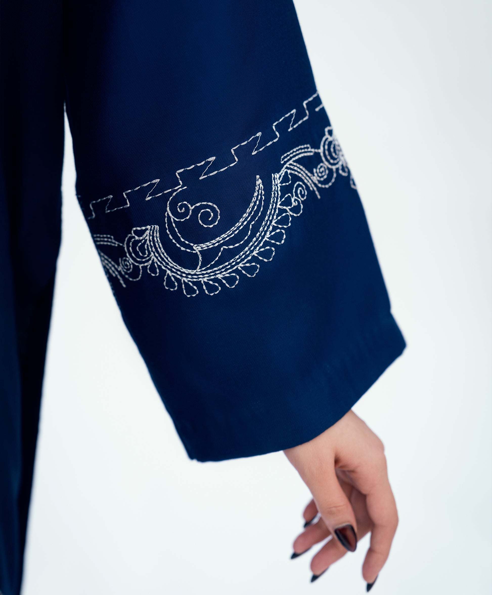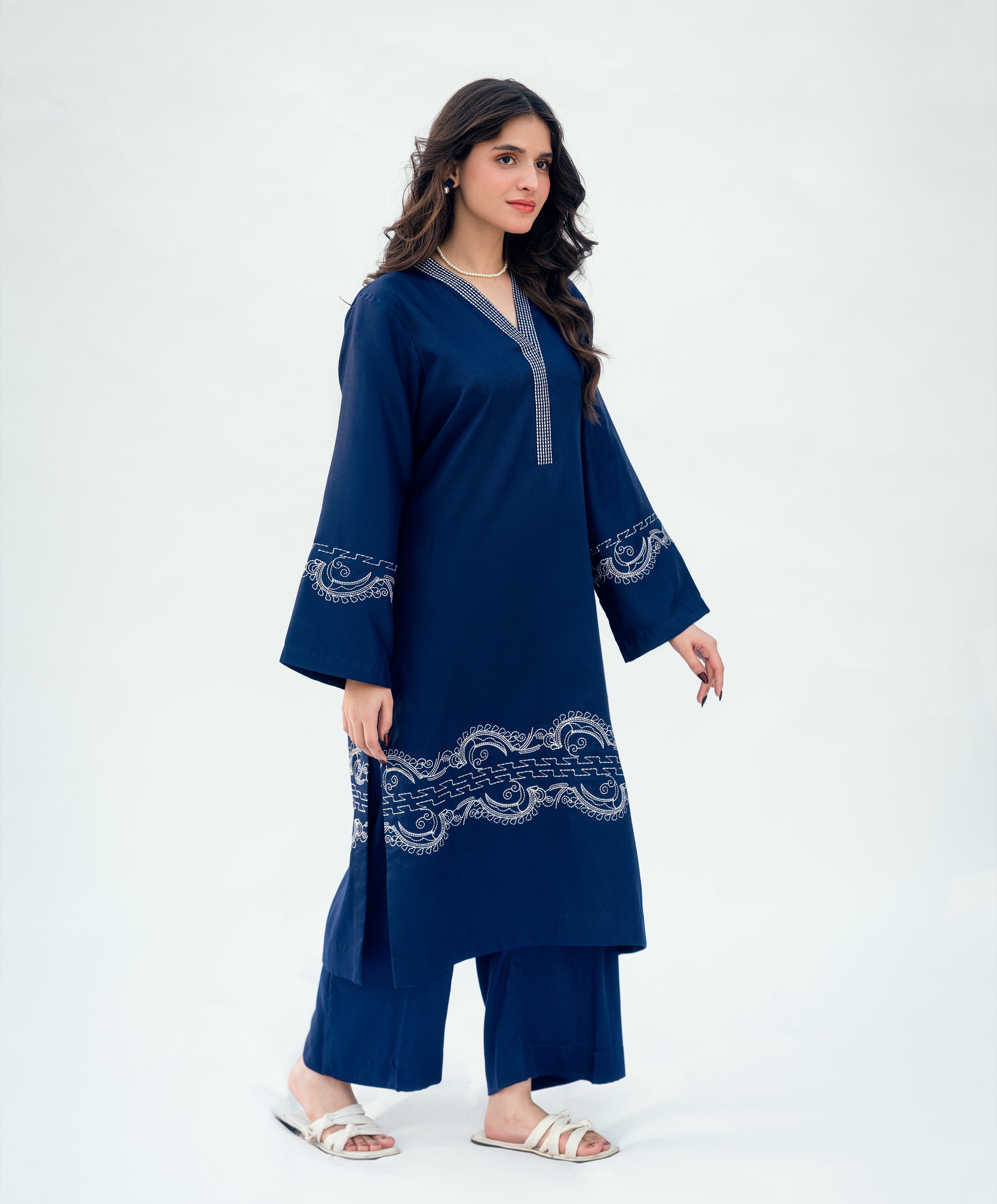 Royal blue two-piece set. Kaantha embroidery on front and sleeves. Straight long shirt with wide-legged straight pants.