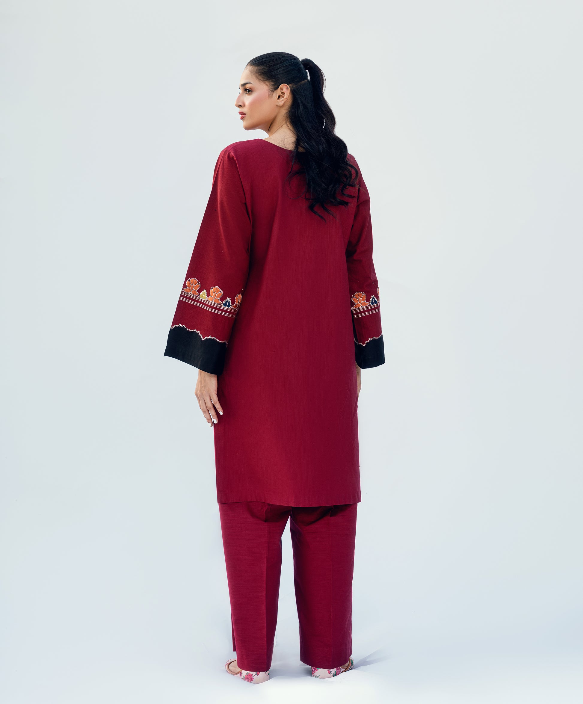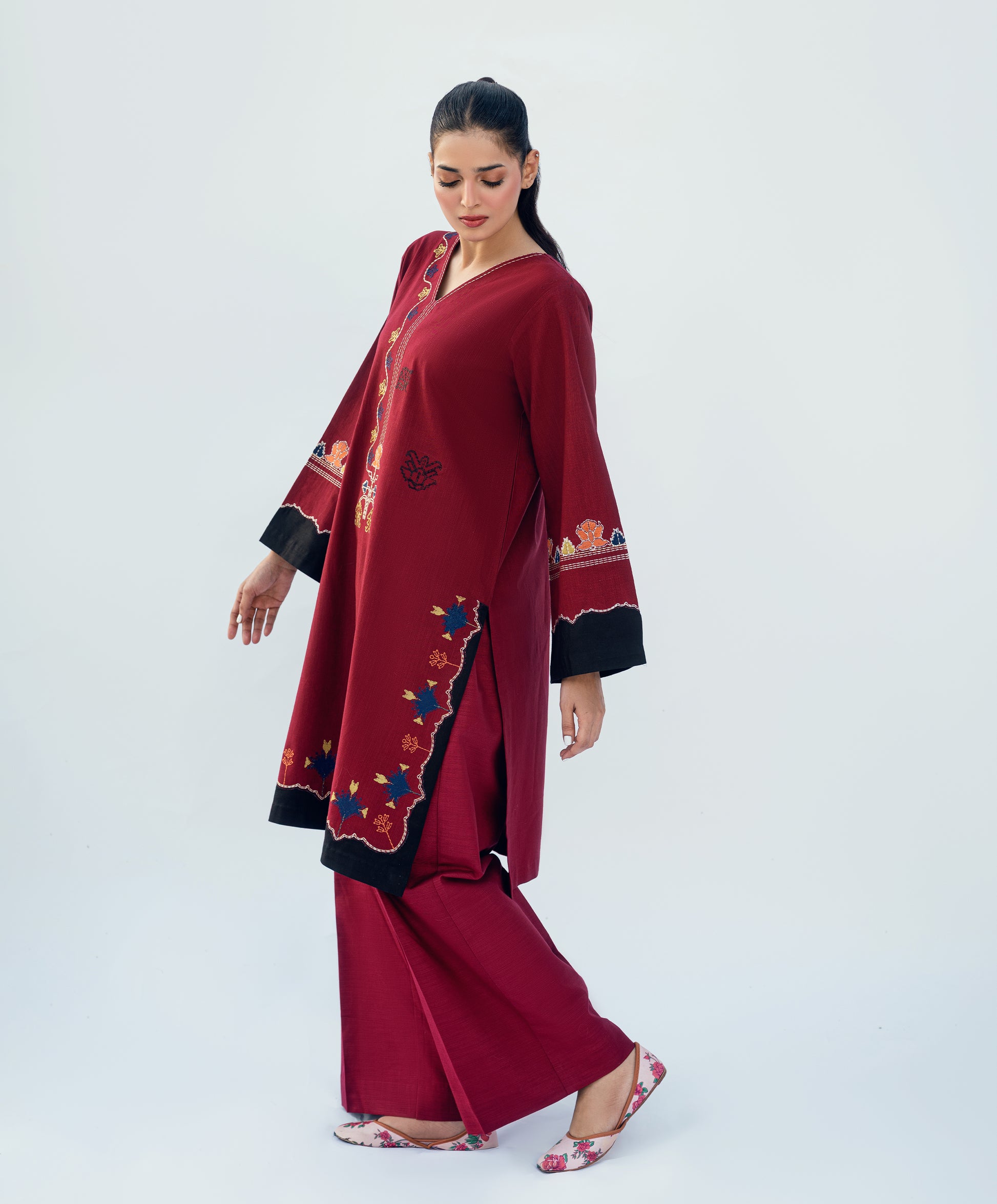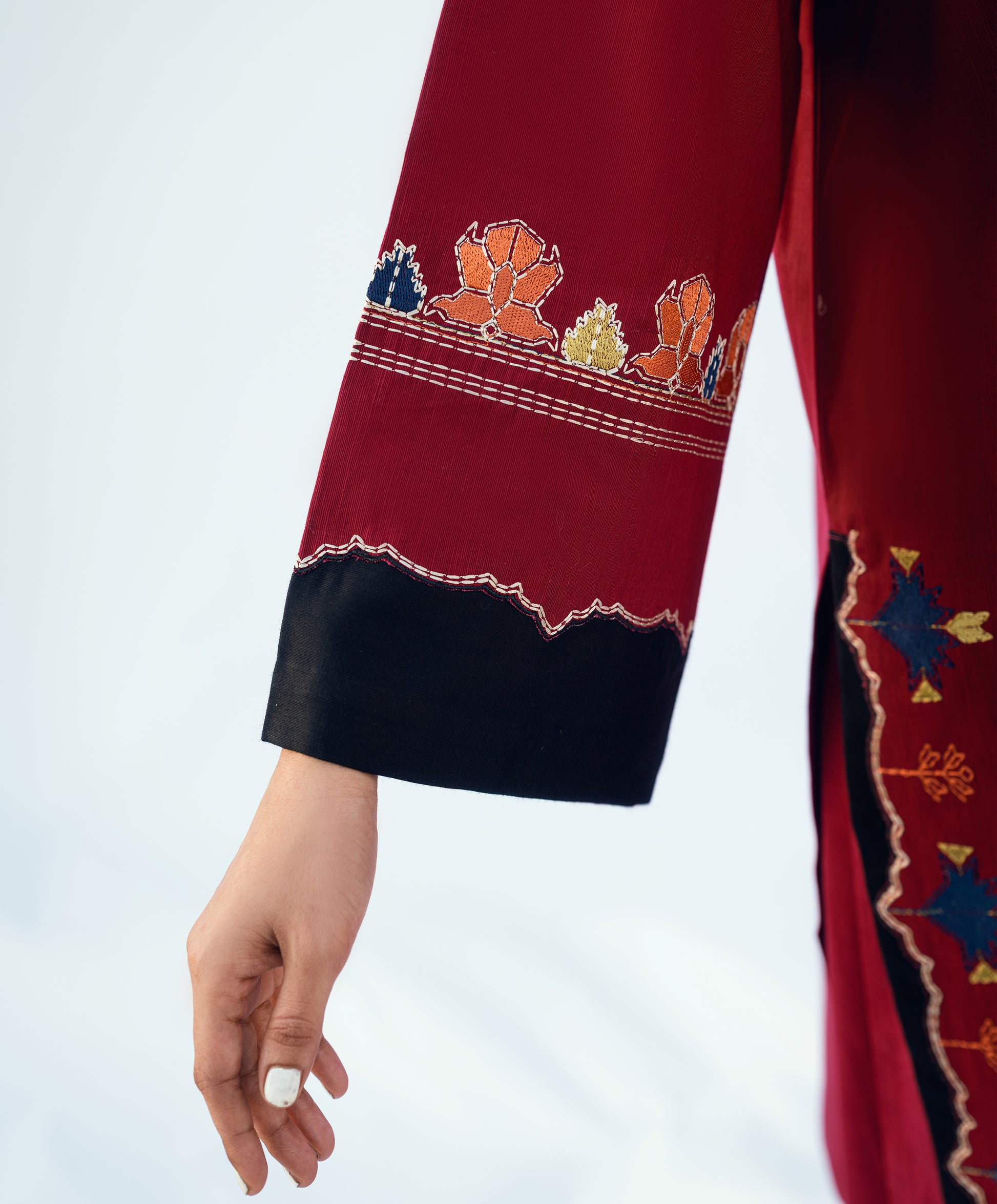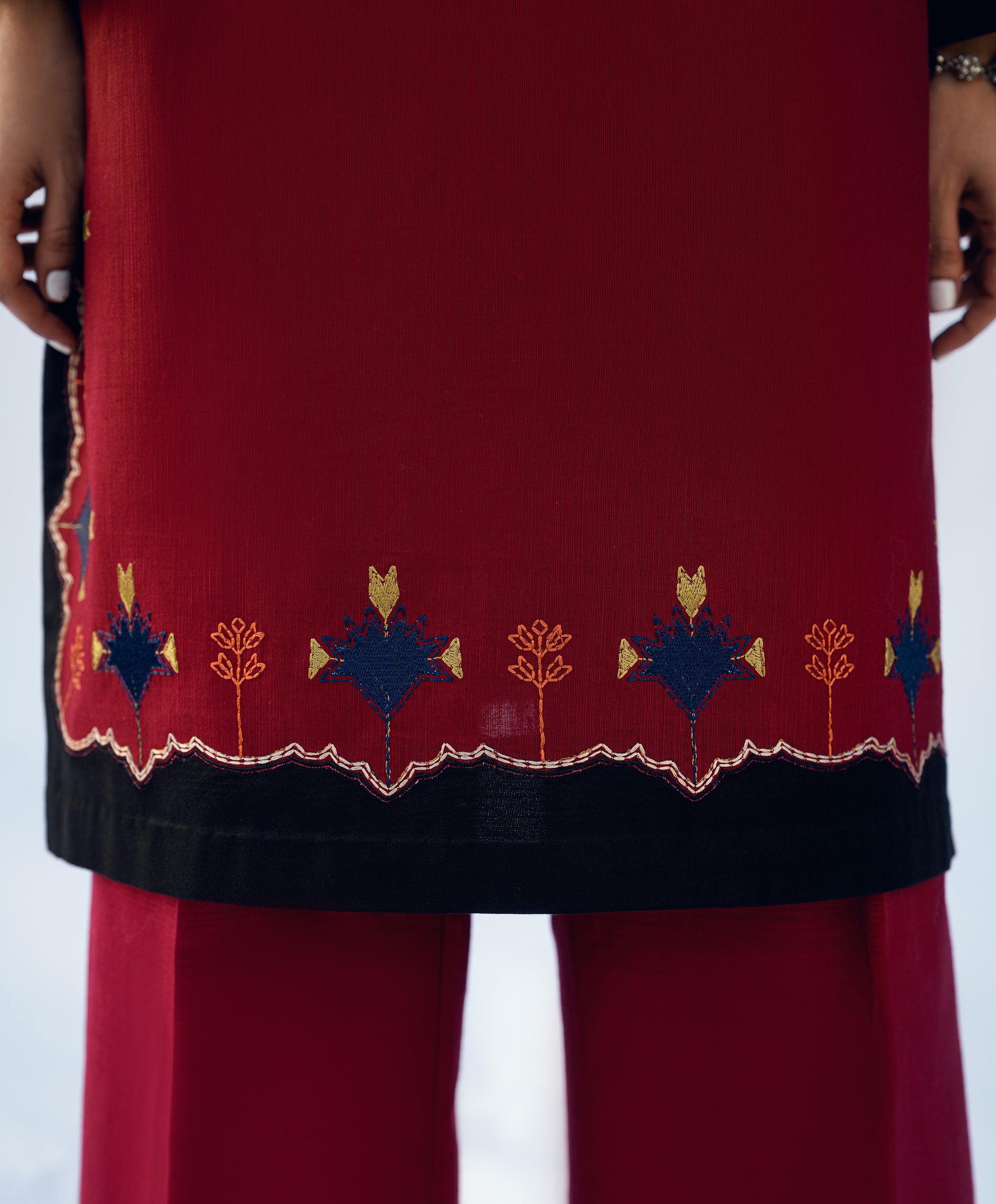 Red khaddar two-piece embroidered set. Phulkari-inspired embroidery with signature kaantha touch on front and sleeves. Straight shirt and wide-legged straight pants.
